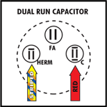 "2" Start - Connect the loose end of the Striped wire to the Start winding side of the run capacitor. The Start winding side of the run capacitor is always marked "HERM". The Start winding side of the run capacitor can also be verified by following the yellow or orange or blue wire (in most cases) from the compressor "S" terminal to the Start winding side of the run capacitor.